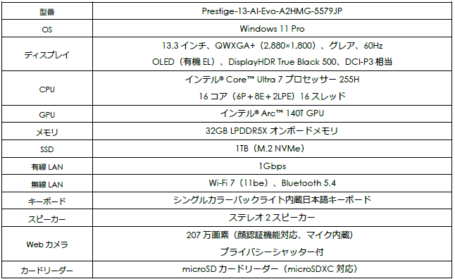 「Prestige 13 AI Evo A2HM」シリーズは、最新の「インテル(R) Core(TM) Ultra 7 プロセッサー(シリーズ 2)」を搭載した軽さ990g・13.3インチ高性能ビジネスノートPCです。