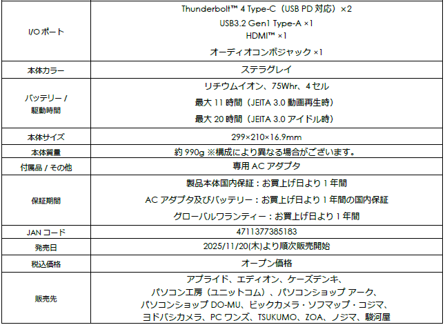 薄さ16.9mm・軽さ990gと「MIL-STD-810H」に適合する高い耐久性と信頼性を併せ持つノートPCを実現するべく、筐体の材質にマグネシウム合金を採用。ビジネスバッグやバックパックへ簡単に収納することができ、営業活動でノートPCを使用するビジネスユーザーや学校で勉強するためのツールとしてノートPCを利用する学生などが“毎日気軽に安心して”持ち運べる超薄型・超軽量デザインとなっています。