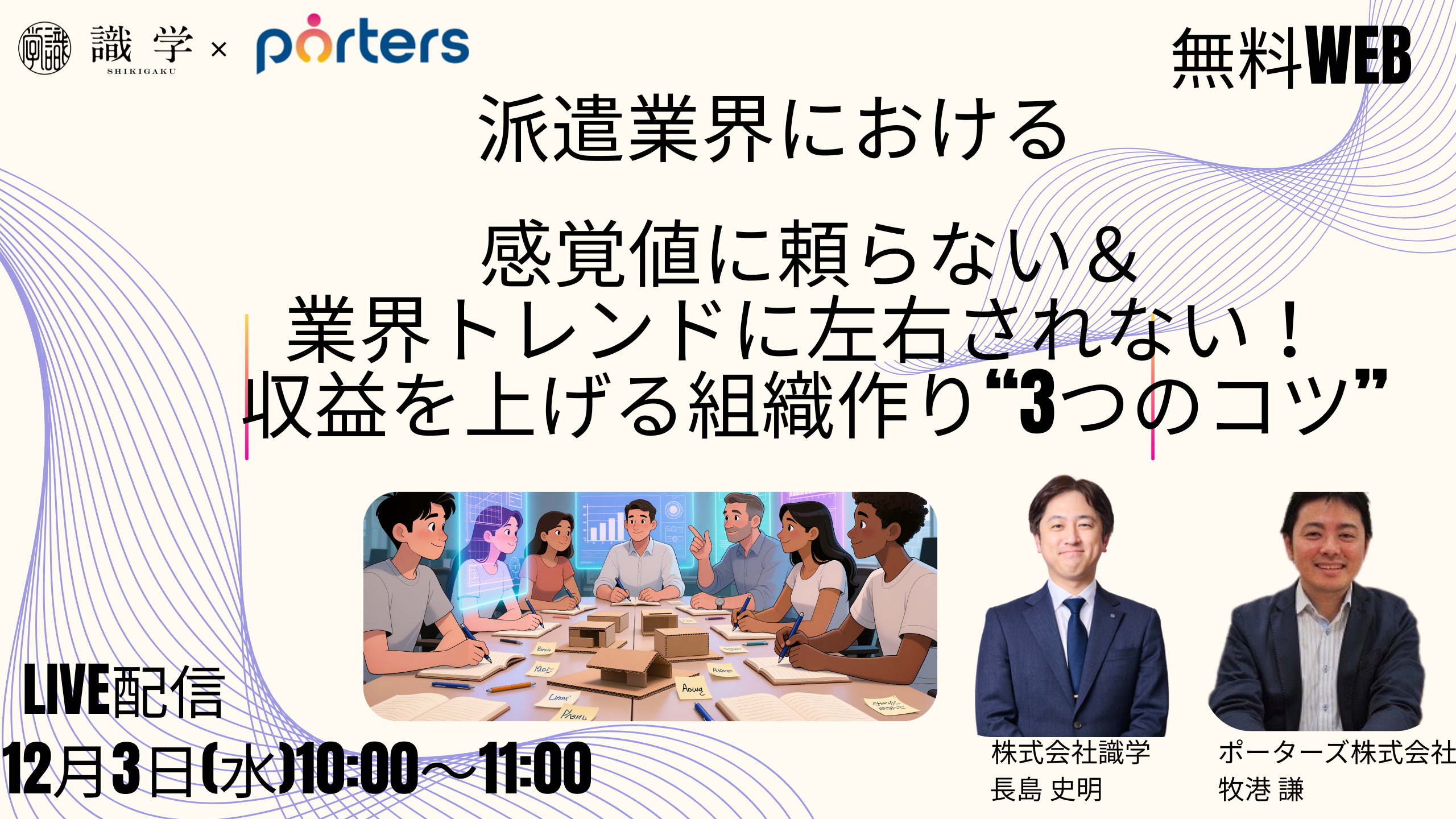 人材ビジネス向けマッチングシステムを提供するポーターズ株式会社(東京証券取引所グロース.証券コード5126、東京都港区、代表 西森 康二)は、株式会社識学(以下、識学)と共同で「派遣業界における感覚値に頼らない&業界トレンドに左右されない!収益を上げる組織作り“3つのコツ”」と題した無料セミナーを2025年12月3日(水)10:00~オンラインで開催いたします。