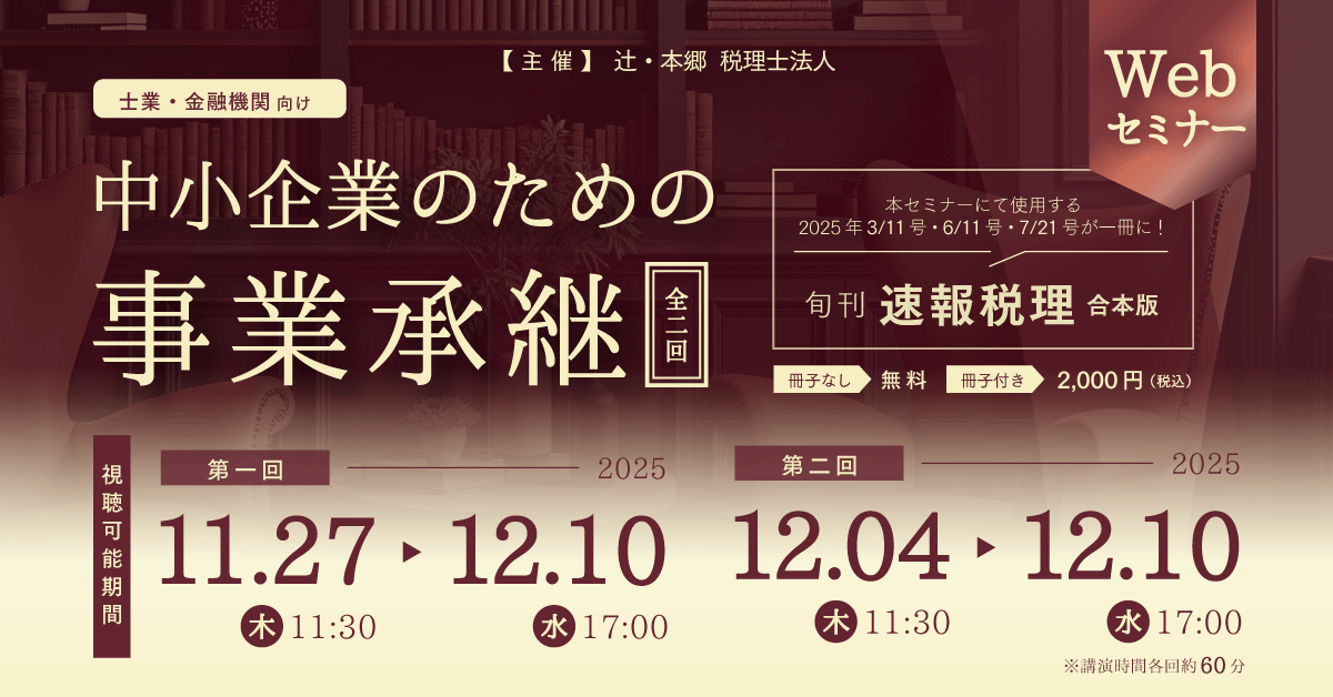 辻・本郷 税理士法人(本社:東京都新宿区、理事長:桑木小恵子)は、2025年11月27日より「【士業・金融機関向け】中小企業のための事業承継<全二回>」セミナーを開催いたします。