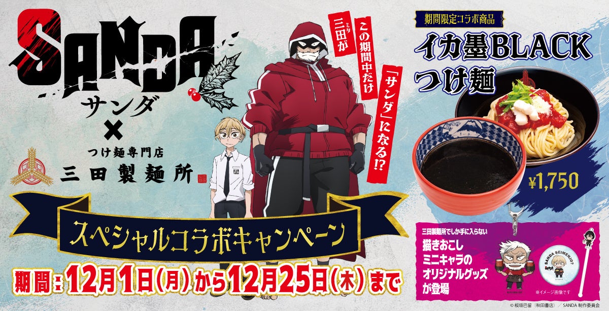 株式会社エムピーキッチンホールディングス(本社:東京都渋谷区、代表取締役:村上竹彦)が運営する「つけ麺専門店 三田製麺所」は、2025年12月1日(月)から12月25日(木)の期間中、TVアニメ『SANDA』とのコラボ商品の販売を、三田製麺所国内全店舗で実施いたします。