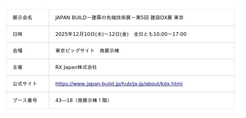 MUSVI株式会社(本社:東京都品川区、代表取締役 / Founder & CEO:阪井祐介、以下「MUSVI」)は、昨年に続き、2025年12月10日(水)~12日(金)に東京ビックサイト(東京都江東区)で開催される「第5回 建設DX展 東京」(JAPAN BUILD-建築・土木・不動産の先端技術展-)に出展することをお知らせします。