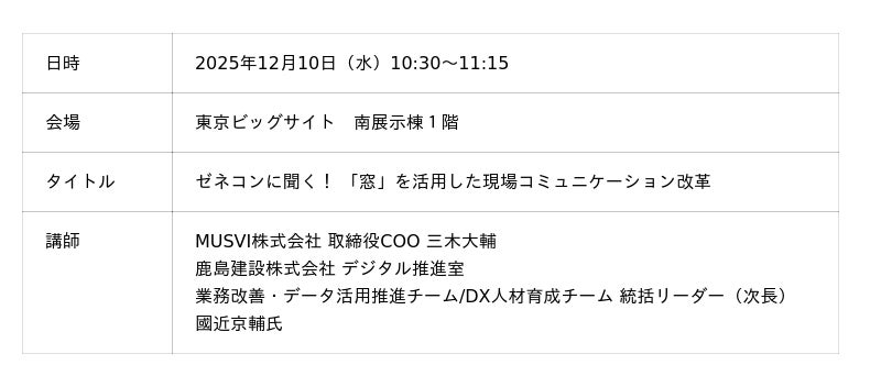 また、12月10日(水)には、「ゼネコンに聞く! 『窓』を活用した現場コミュニケーション改革」と題して、MUSVI取締役COOの三木大輔が「窓」を積極的に活用されている鹿島建設様とともにセミナーに登壇します。