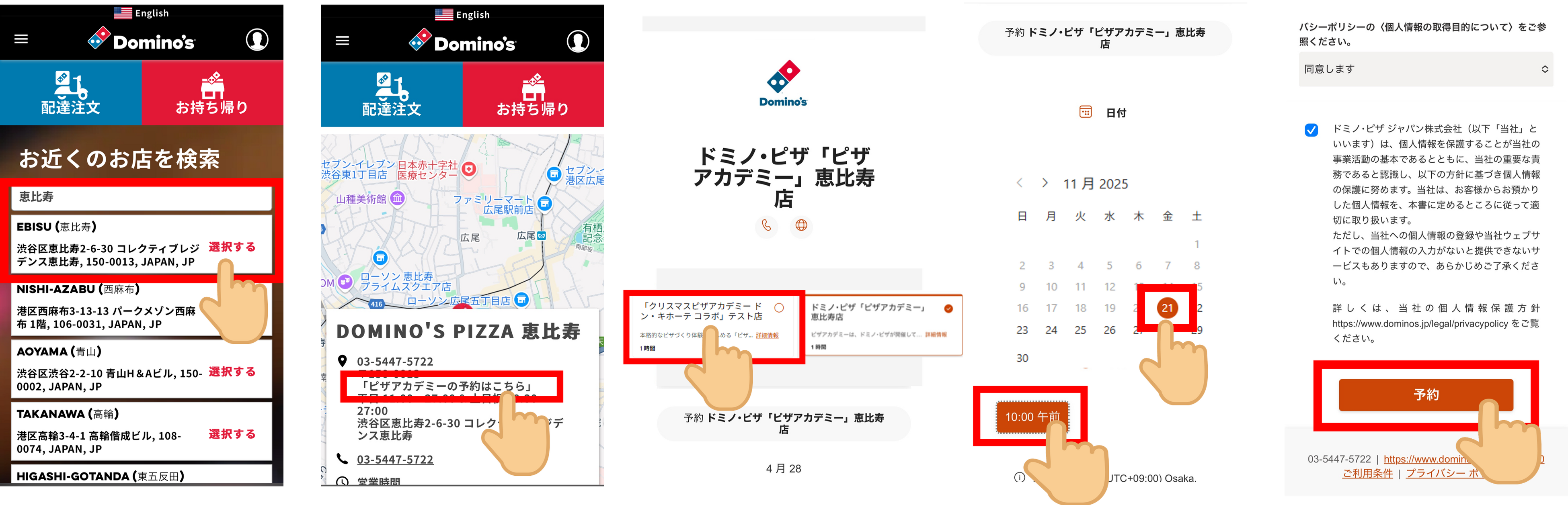 「クリスマスピザアカデミー ドン・キホーテ コラボ」ご体験を希望の場合は、ご予約時に、「クリスマスピザアカデミー ドン・キホーテ コラボ」を選択いただき、参加当日、担当店舗のスタッフに「クリスマスピザアカデミー ドン・キホーテ コラボ」ご希望の旨をお伝えください。