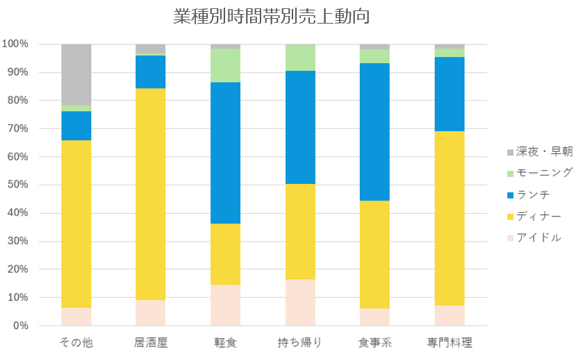 - 業種別時間帯別売上動向を見ると、10月度でディナータイムの売上割合が一番多いのは居酒屋、次に専門料理となりその差は13.3ptとなった。一方ランチタイムの売上割合が一番高いのは、軽食、次に食事系となり、その差は1.4ptとなった。