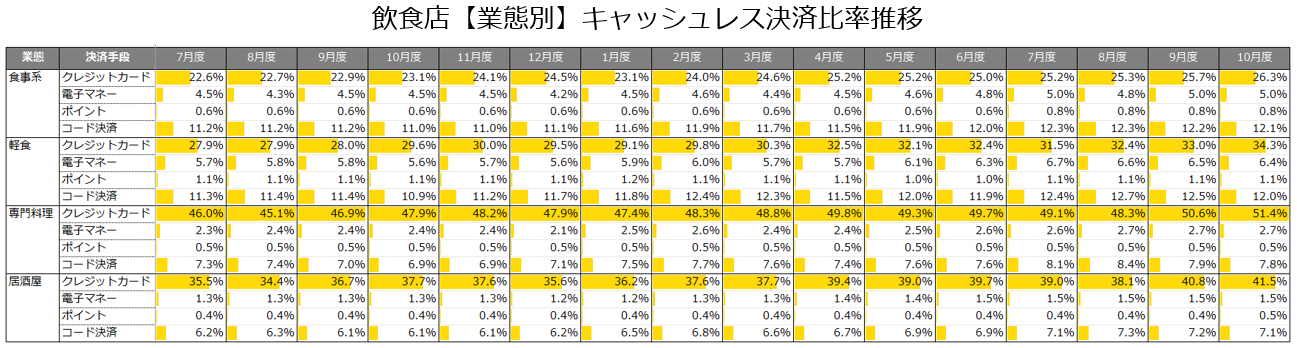 - キャッシュレス決済手段別で見ると、9月度から10月度にかけて、すべての業態でクレジットカードの決済比率が増加した。