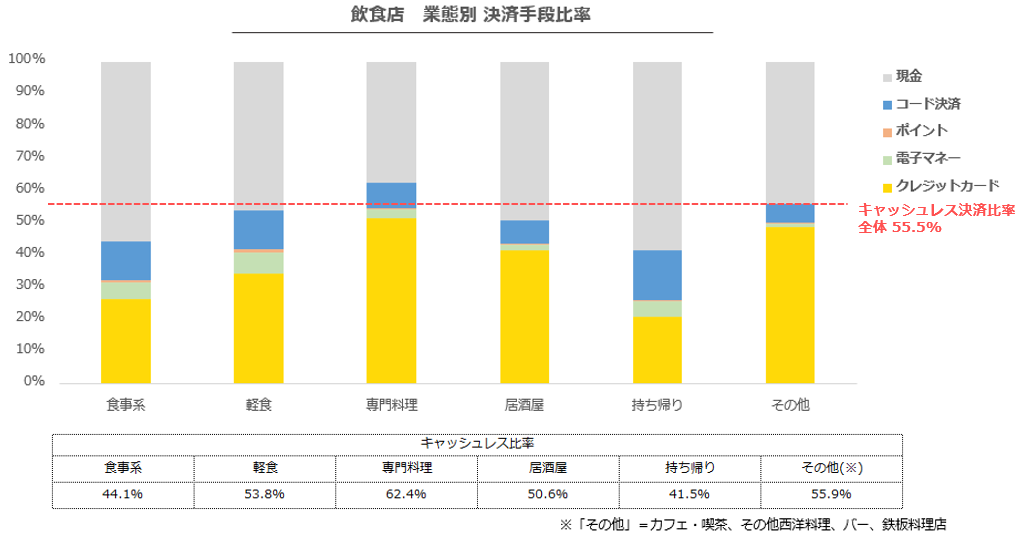 - 業態別のキャッシュレス比率は、すべての業態で40%を超える。
