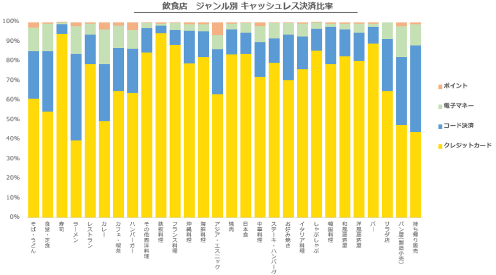 - キャッシュレス決済に占める各決済手段の比率をジャンル別に見ると、クレジットカードの比率が高いのは寿司と鉄板料理で、いずれも90%を超える。コード決済の比率が高いのはラーメン・持ち帰り販売で、40%を超える。