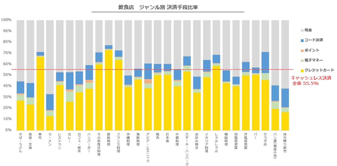 集計内容:飲食店 ジャンル別 キャッシュレス決済方法比率、キャッシュレス決済比率(内訳)