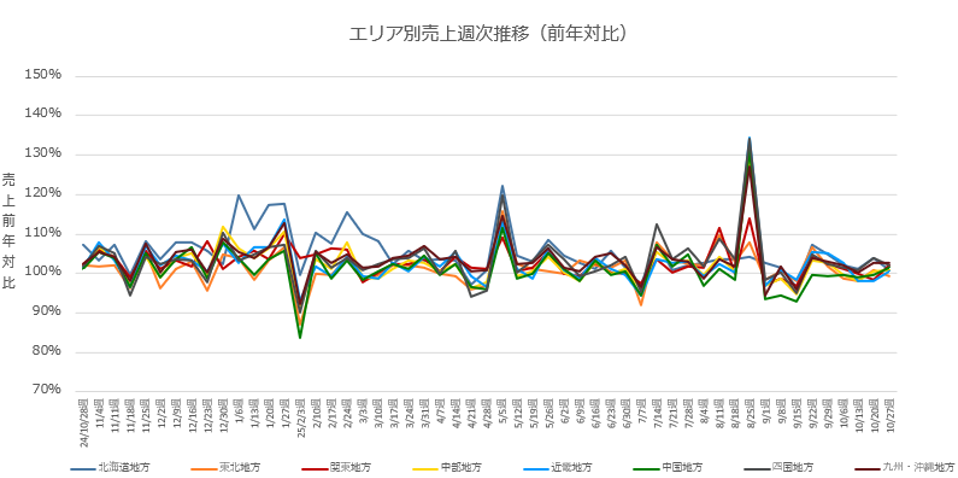 - 10月売上における、前年対比の伸長率(地方平均)は100.6%と前月から0.6pt増加した。各地域の売上伸長率は、北海道地方と四国地方が1位タイで前年対比102.0%となった。