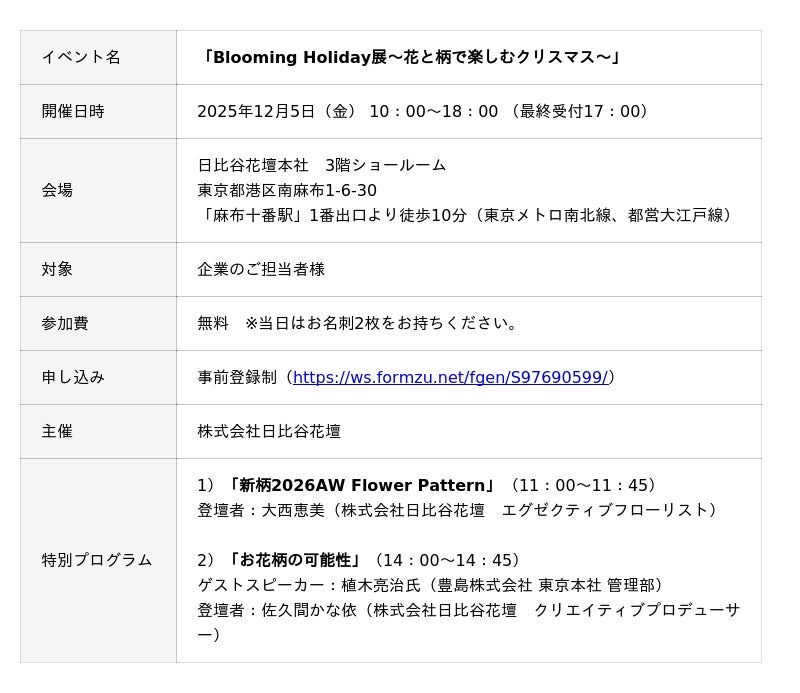 2025年12月5日(金)に港区・日比谷花壇本社にて、企業向け花柄ライセンス展示会「Blooming Holiday展~花と柄で楽しむクリスマス~」を開催します。