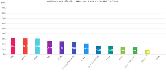 A型ベビーカーを入手する際に重視したものは「価格」が31.4%と最も多く、次いで「安全性」は31.1%、「機能性」が30.9%という結果になりました。