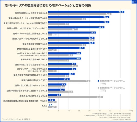 モチベーションの高低による苦労を比較すると、『後輩指導のモチベーションが高い人』は低い人に比べて、「育成のゴールを設定し計画を立てること」が21.2ポイント、「後輩と良好なコミュニケーション(質)を担保すること」が19.4ポイント高くなりました。一方、『後輩指導のモチベーションが低い人』は高い人に比べて、「改善点を次に活かしてもらうこと」が20.1ポイント高くなりました。(図4)