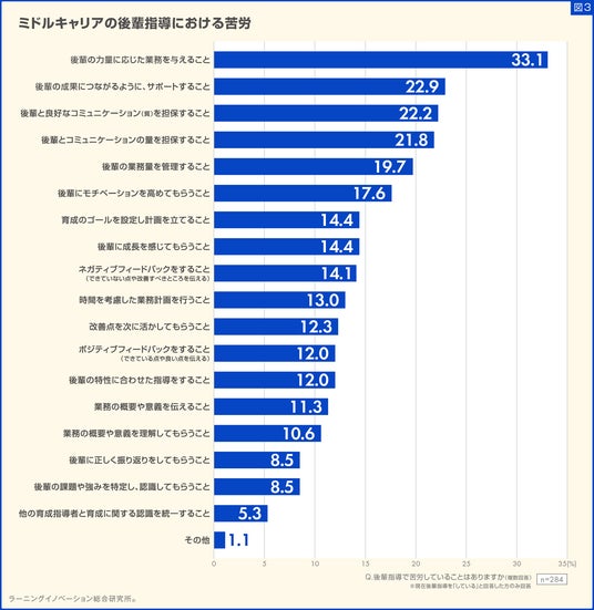 結果、後輩指導で最も苦労している項目は「後輩の力量に応じた業務を与えること」が33.1%と、2位の回答と10ポイント以上の差をつけて突出した結果となりました。次に、「後輩の成果につながるように、サポートすること」(22.9%)、「後輩と良好なコミュニケーション(質)を担保すること」(22.2%)が続きました。(図3)