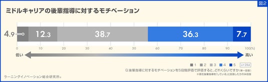 結果、モチベーションが最も高い評価「5」の回答割合は7.7%、やや高い評価「4」の回答割合は36.3%となり、約4割がモチベーション高く取り組んでいることがわかりました。しかし、後輩指導に関わっているすべてのミドルキャリアが意欲的に取り組んでいるわけではないことも明らかになりました。(図2)