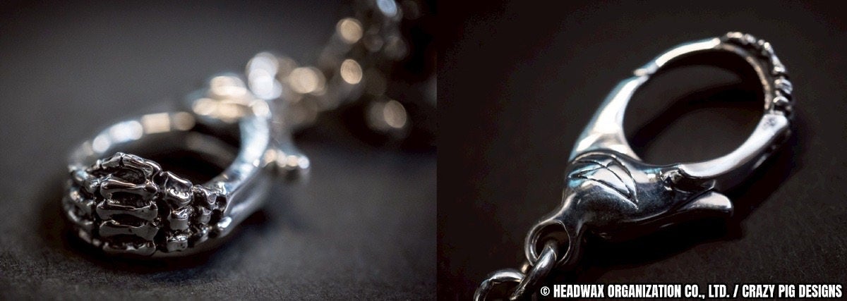 カラビナは、サイコベアをより日常に身近に感じられる解決策として新たにデザインされました。hideが愛用したCRAZY PIG DESIGNSの代表作『ボーンハンドリング』のオマージュとして骨の手の装飾が施され、hideとCRAZY PIG DESIGNSとの絆を象徴します。