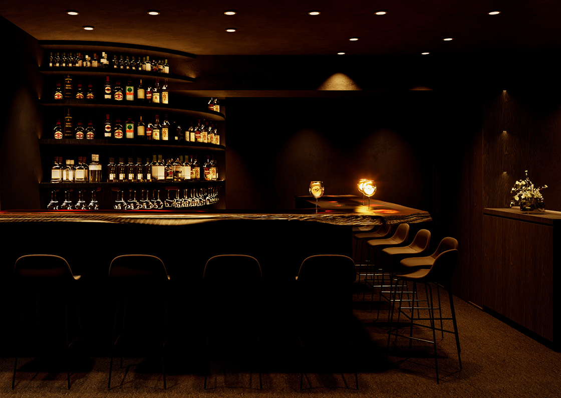 カウンター席は、最大10人までご用意。隣席との距離感に配慮し、プライベートゾーンを保ちながらドリンクを楽しめるレイアウトに調整。さらに、お酒のボトルがどの席からも視界に入るよう、湾曲型のボトル棚を構えました。明るさを抑えた照明とシンプルな空間設計によって、上質な店内体験をお約束します。
