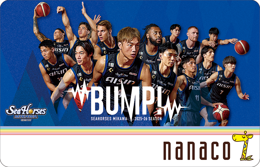 シーホース三河は、愛知県刈谷市をホームタウンとするプロバスケットボールチームで、B1 リーグ西地区に所属の日本で2 番目に歴史が長いチームです。国内トップリーグでは6 度の優勝、天皇杯は9 度の戴冠と数々のタイトルを獲得してきました。今回の券面は、2025‐26 シーズンのチームメンバーが勢揃いの豪華なデザインとなっております。お客さまから応援いただいたnanaco ポイントは、チームの強化に役立てられ、応援状況に応じてオリジナルグッズ等、特典もご用意しております。