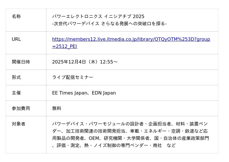 アイティメディア株式会社(本社:東京都千代田区、代表取締役社長 兼 CEO:小林教至、以下アイティメディア)は、2025年12月4日(木)に「パワーエレクトロニクス イニシアチブ 2025」を開催します。本イベントは、エレクトロニクス技術に携わる開発者や企画担当者に向けて、「EE Times Japan」「EDN Japan」が主催するデジタルイベントで、「次世代パワーデバイス さらなる発展への突破口を探る」をテーマに、パワーエレクトロニクス分野の有識者を基調講演に招き、エレクトロニクス技術の最新情報をお届けします。
