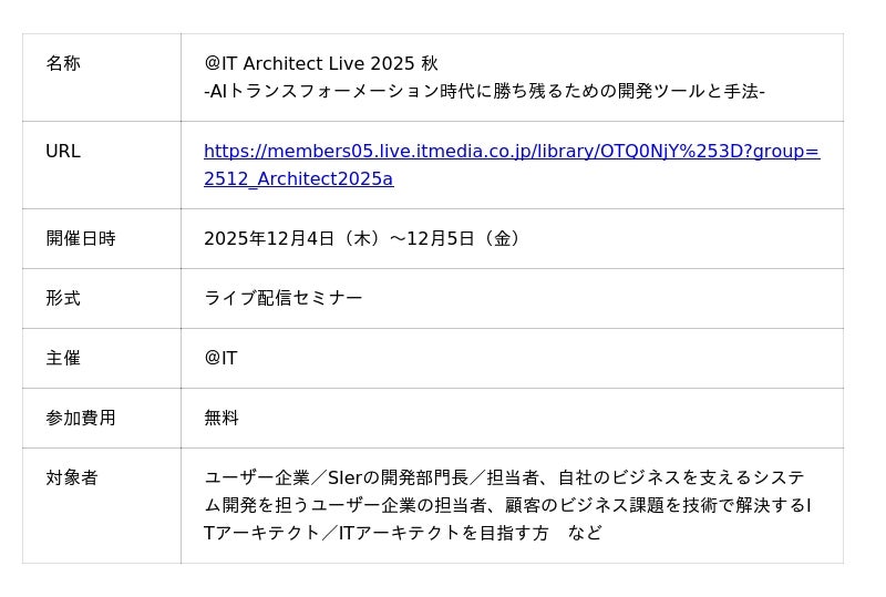 アイティメディア株式会社(本社:東京都千代田区、代表取締役社長 兼 CEO:小林教至、以下アイティメディア)は、2025年12月4日(木)~5日(金)に「@IT Architect Live 2025 秋」を開催します。本イベントは「@IT」が情報システム部門の担当者や開発者に向けて行うデジタルイベントで、「AIトランスフォーメーション時代に勝ち残るための開発ツールと手法」をテーマに、2つのセクションで講演・セミナーを実施します。