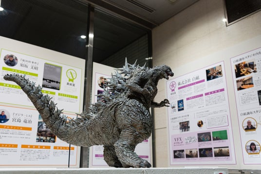 さらに、上映会の会場の文化会館たづくりでは、『ジュブナイル』のデザイン画や絵コンテ等の関連展示のほか、『ゴジラ-1.0』の撮影で使用されたバラックのミニチュアや、リファレンス撮影用ゴジラを展示。山崎監督へインタビューをした様子を紹介するパネル展示も実施しています。