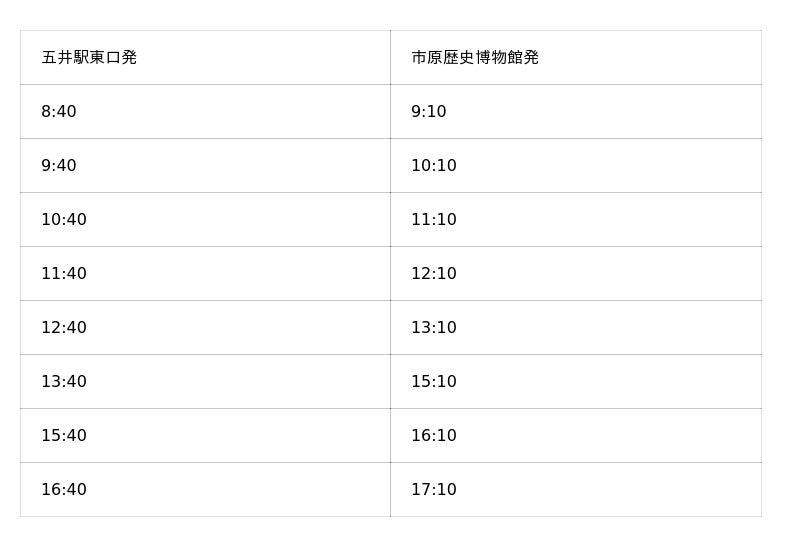 時間:JR五井駅は毎時40分、博物館は毎時10分発車