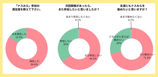 「ナスみら」参加の満足度を教えて下さい。:「満足した」84.6%、「まあ満足した」15.4%、「あまり満足していない」「満足していない」共に0%