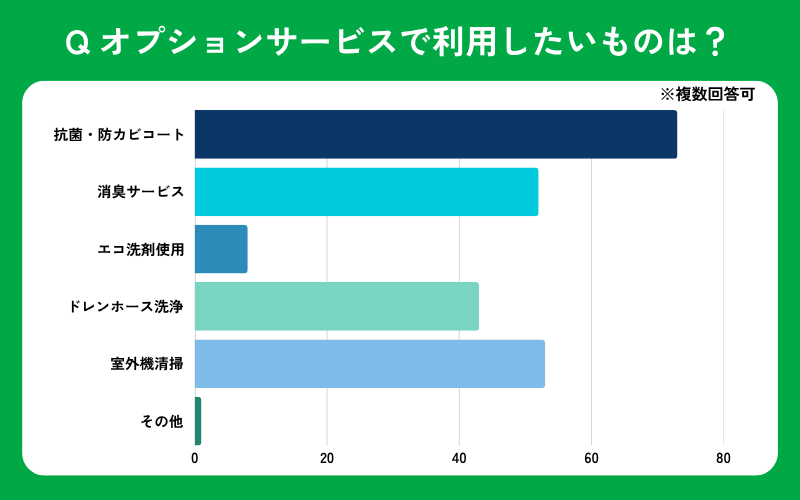 ・エアコンクリーニングのオプションで希望が多いのは「抗菌・防カビコート」「室外機清掃」。