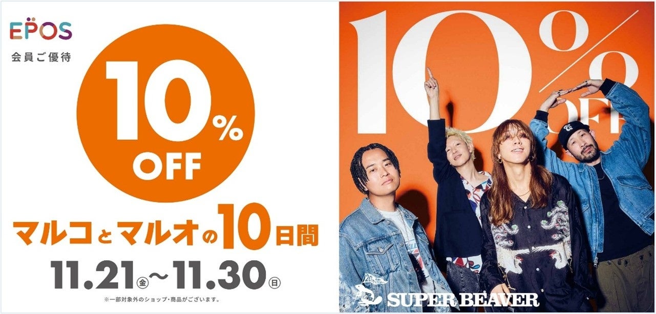 株式会社丸井(本社:東京都中野区、代表取締役社長:青野 真博)は、2025年11月21日(金)~11月30日(日)の10日間、マルイ・モディ全店およびマルイのネット通販「マルイウェブチャネル」にて、エポスカード会員ご優待キャンペーン『マルコとマルオの10日間』を開催いたします。期間中、エポスカードのクレジットでのお支払いで、10%OFFにてお買物いただけます。また、今回の『マルコとマルオの10日間』は、「SUPER BEAVER」のデビュー20周年を記念してコラボレーション企画を実施いたします。
