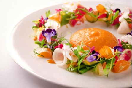 「ベジブーケ・ファースト ”冬野菜のサラダ 柑橘のエスプーマ“ 」その時期に美味しい15種類以上の野菜をシェフが厳選したシグネチャーサラダ。ホリデーシーズンらしくリース仕立てにてご用意しました。冬の美肌作りに欠かせない甘みと酸味を程よくたたえたビタミンたっぷりの柑橘類に、「奇跡の果実」とも呼ばれ200種類以上の栄養成分を含むスーパーフードのサジーを使用したオレンジ色のエスプーマが添えられます。「ベジファースト※」として最初にお召し上がりください。