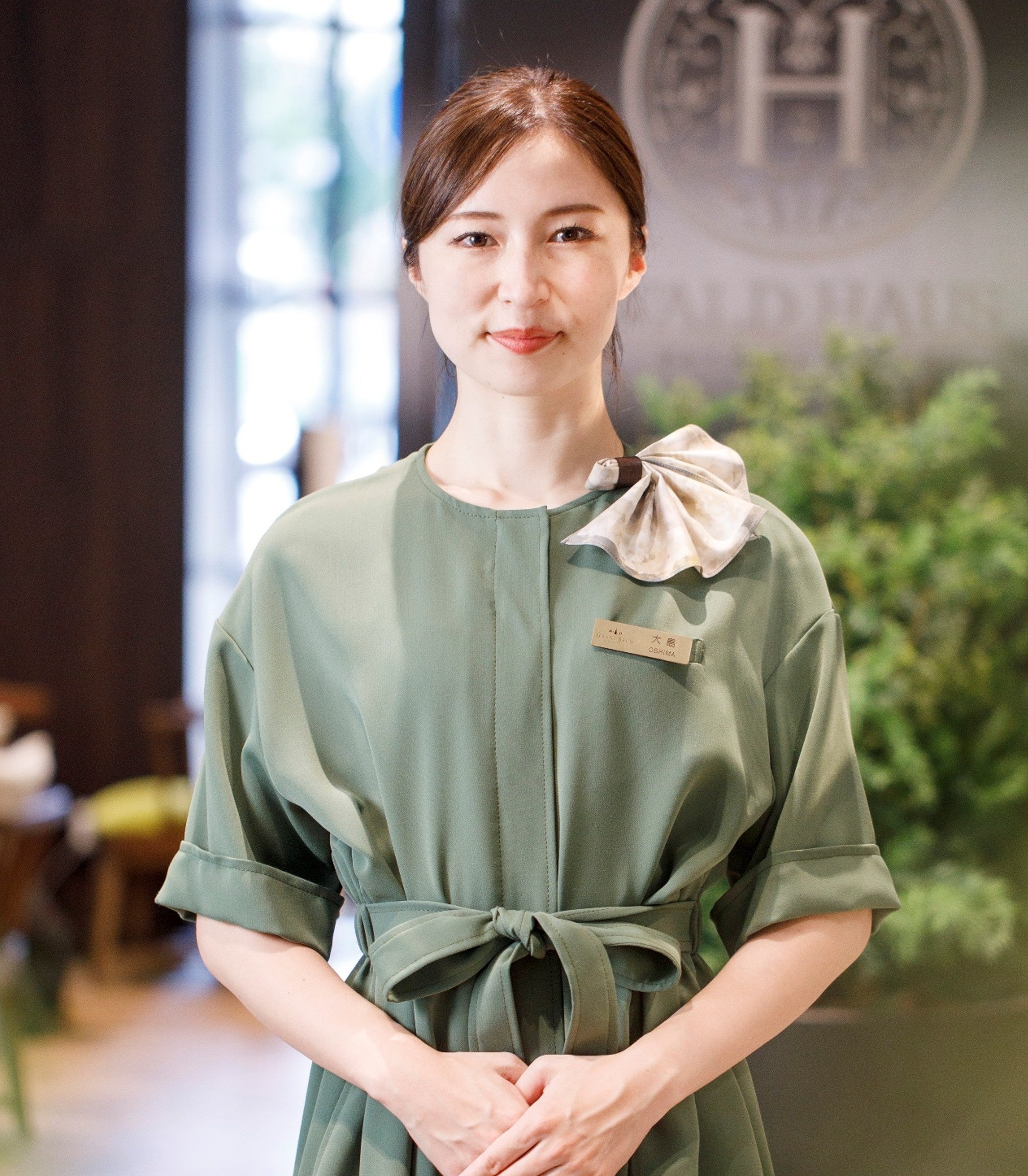 大学で栄養学を学び、管理栄養士資格を取得後、2012年に株式会社グリーンハウスへ入社。法人向けのメニュー開発・栄養管理や、特定保健指導など、食と健康に関わる業務に幅広く携わる。2021年、ホテルグランバッハブランド初の「ウェルネスフード・コンシェルジュ」に就任。現在はシェフと連携し、ウェルネスをテーマにした料理やスイーツの開発に加え、来館ゲストへの食事、運動や睡眠についてのトータルな案内なども行っている。