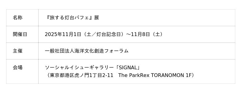 日本財団「海と灯台プロジェクト」を運営する一般社団法人海洋文化創造フォーラムは、「海と灯台ウィーク2025」キャンペーンの一環として、「灯台記念日」の11月1日から8日までの8日間、ソーシャルイシューギャラリー「SIGNAL」(東京都港区)にて、『旅する灯台パフェ』展を開催しました。このイベントは、次世代へ豊かで美しい海を引き継ぐために、海を介して人と人とがつながる“日本財団「海と日本プロジェクト」”の一環として実施されました。