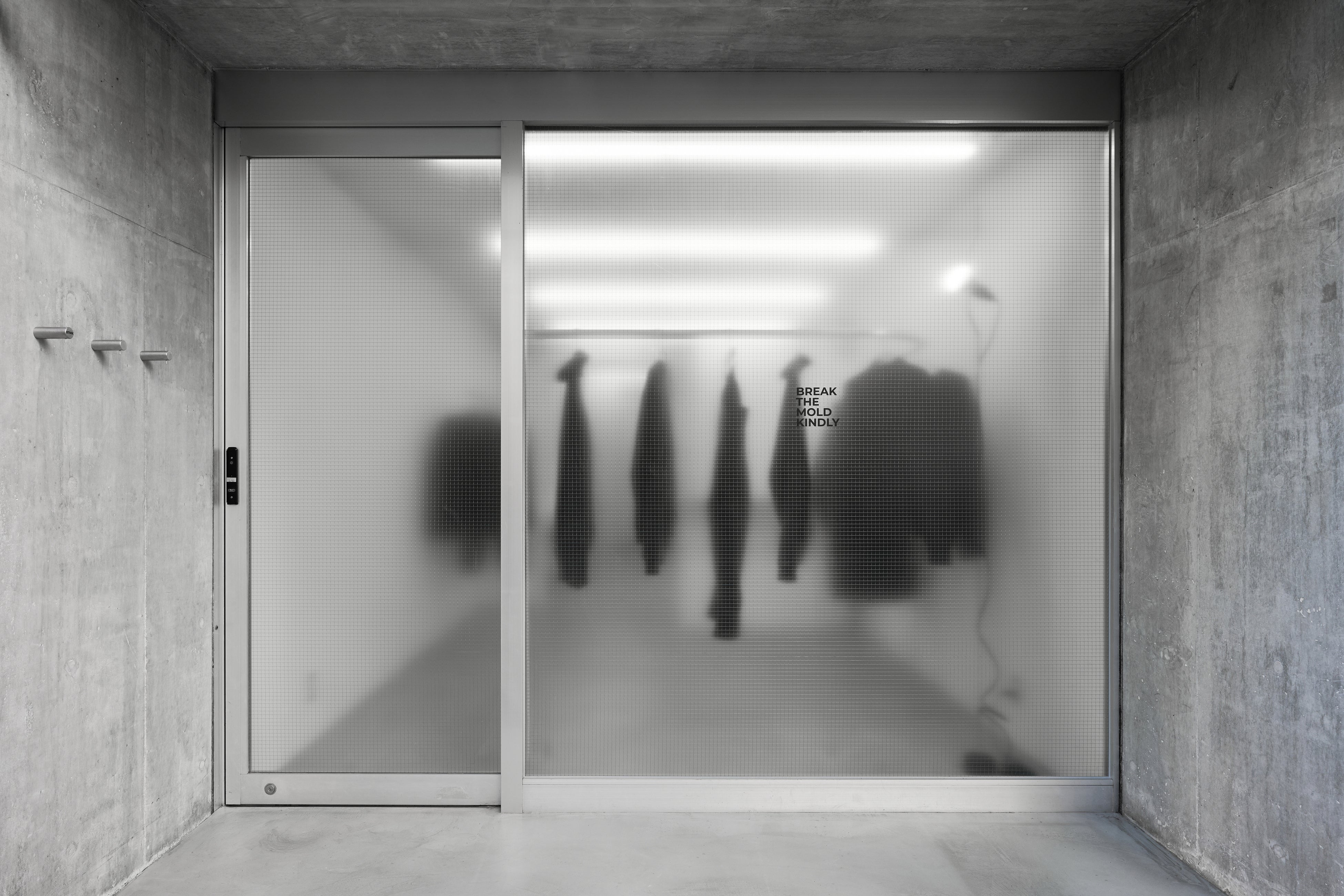 白やグレーの無彩色で造られた無機質な空間の中で、テキスタイルメーカー発のBTMKならではのオリジナル生地や染色が織りなすブラックの服、ウォッシュ加工やガーメントダイの服、ブランドの得意とする技法やこだわりのディテールが際立って立ち並びます。