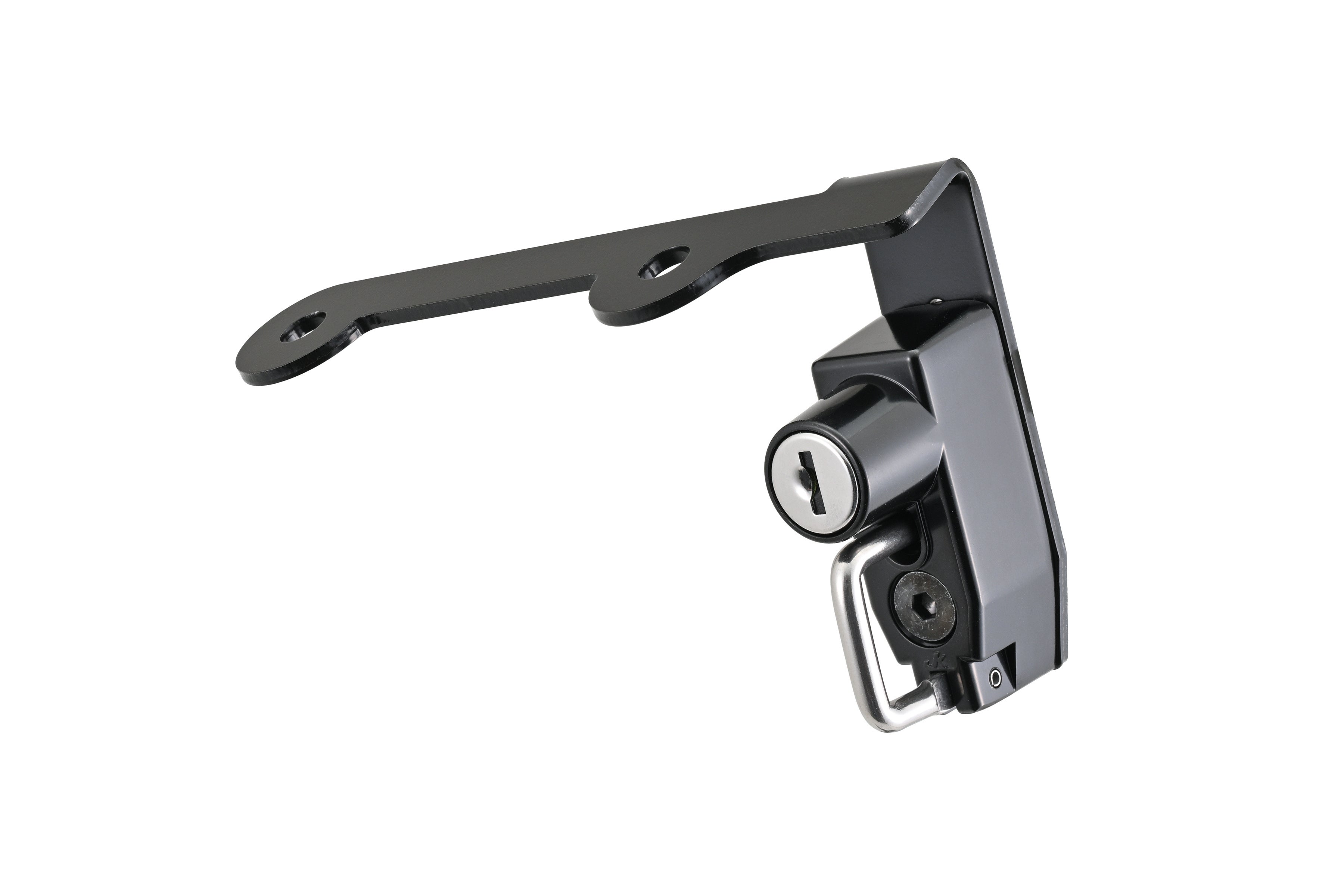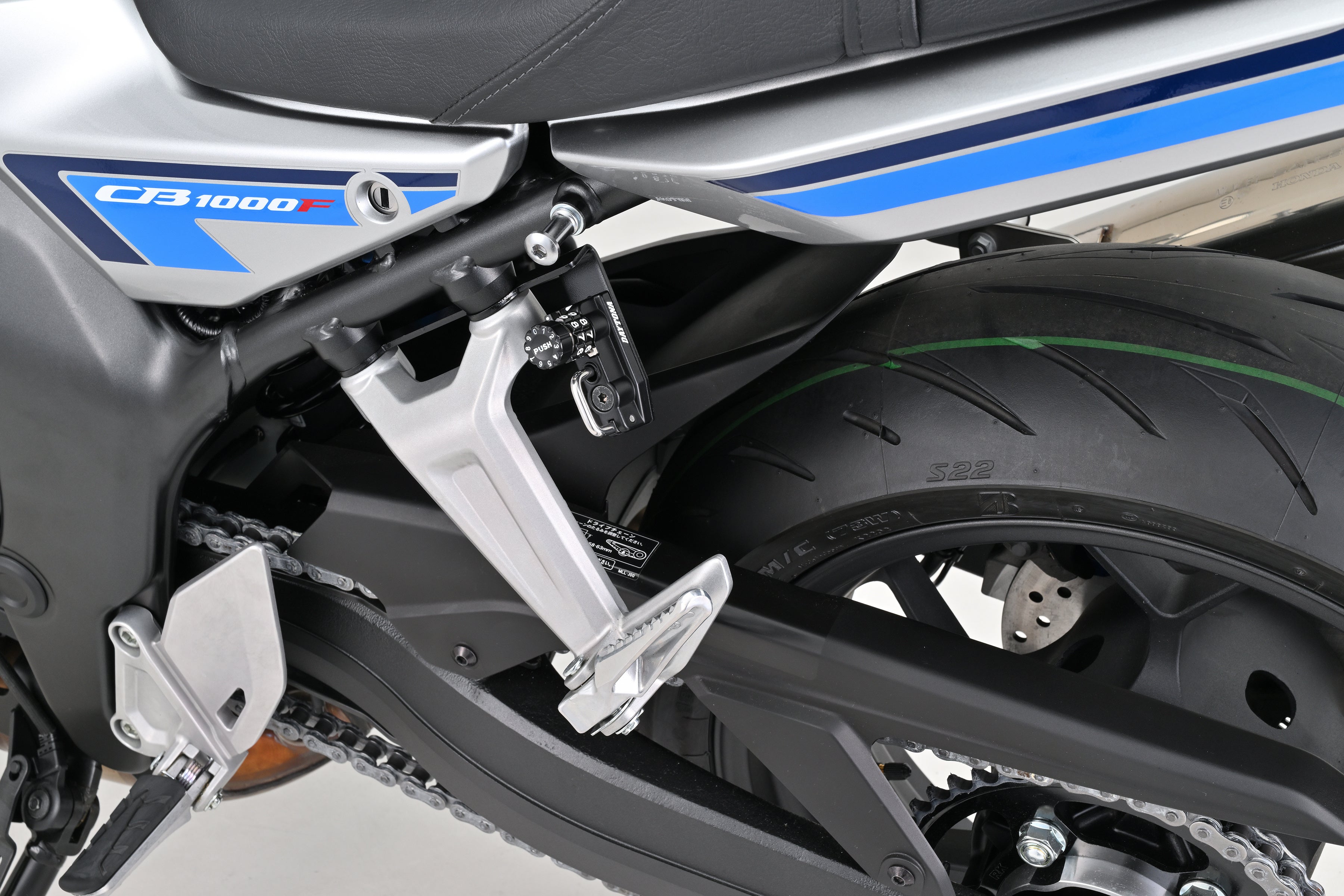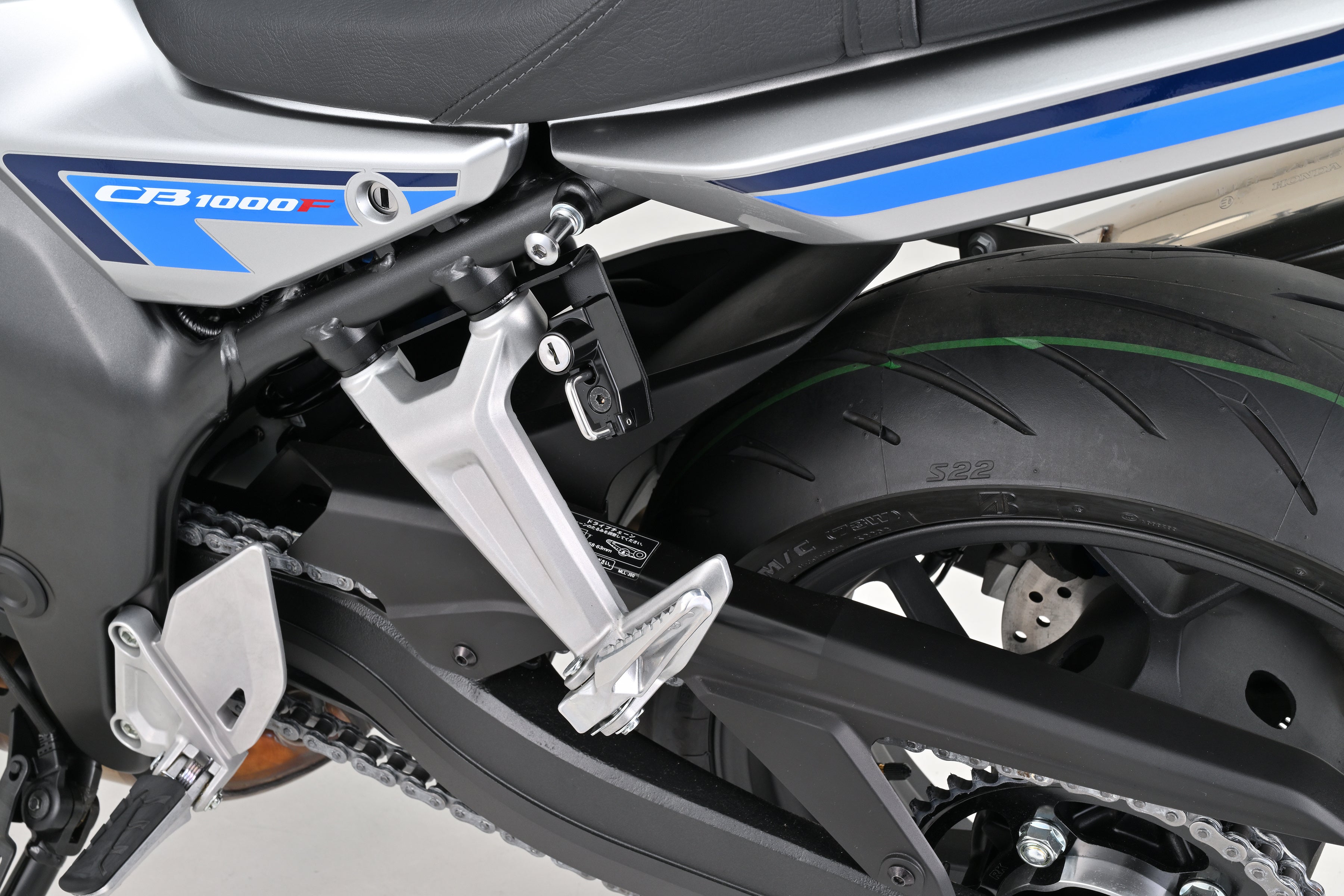 キータイプのヘルメットホルダー。タンデムステップのステーに共締めして装着します。純正ライクな見た目で、車両の雰囲気を崩しません。(カギ2本付属)