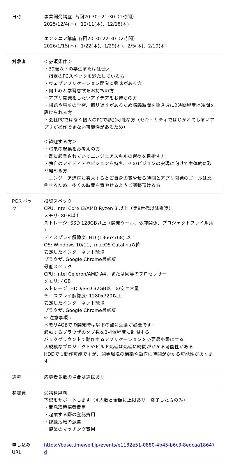 アプリ開発から起業支援の一部費用を含めてサポートする大人気プログラムの5期が2025年12月開講。学生やエンジニア未経験者大歓迎!