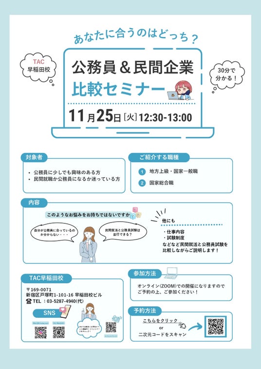 【TAC公務員】「あなたに合うのはどっち?公務員&民間企業 比較セミナー」を11/25(火)にオンラインで配信!