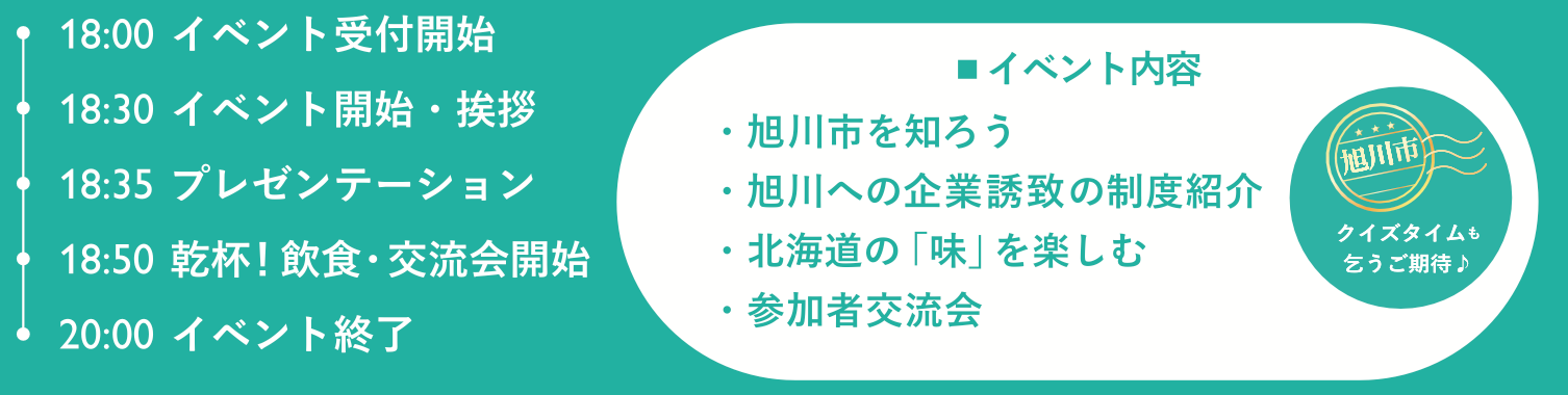 - 旭川ビジネスの「今」を知る 旭川市の現状 や、進出を強力に後押しする具体的な企業誘致制度を、旭川市から直接ご紹介します。地方での事業展開の具体的なヒントを得られます。- 独自の視点から見る旭川地元企業からのリアルなプレゼンテーション 地元企業の生の声を通じて、「旭川ってこんなに面白い場所だったのか!」という新たな発見があるはずです。もしかしたら、旭川ゆかりの景品が当たるクイズ企画もございます。