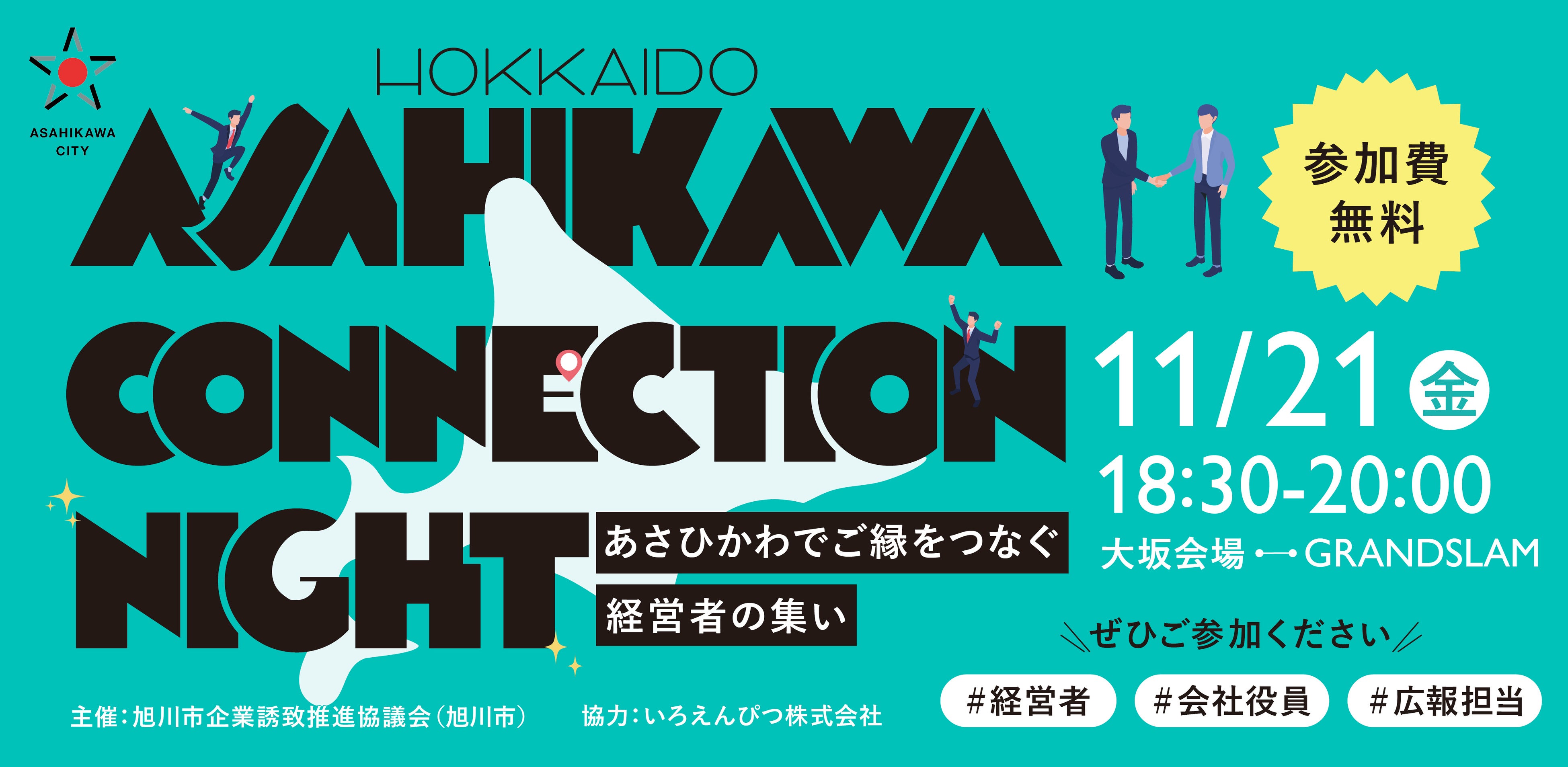 いろえんぴつ株式会社(本社:北海道旭川市、代表取締役:大田原 裕希、以下 いろえんぴつ)は、旭川市企業誘致推進協議会(北海道旭川市)を主催とし、地方での事業展開やサテライトオフィス設立を検討する経営者・会社役員・広報担当者など「あさひかわでご縁をつなぐ」ビジネス層を対象とした交流会「ASAHIKAWA CONNECTION NIGHT」に協力企業として参画し、東京・大阪の2都市で交流会を開催することをお知らせします。
