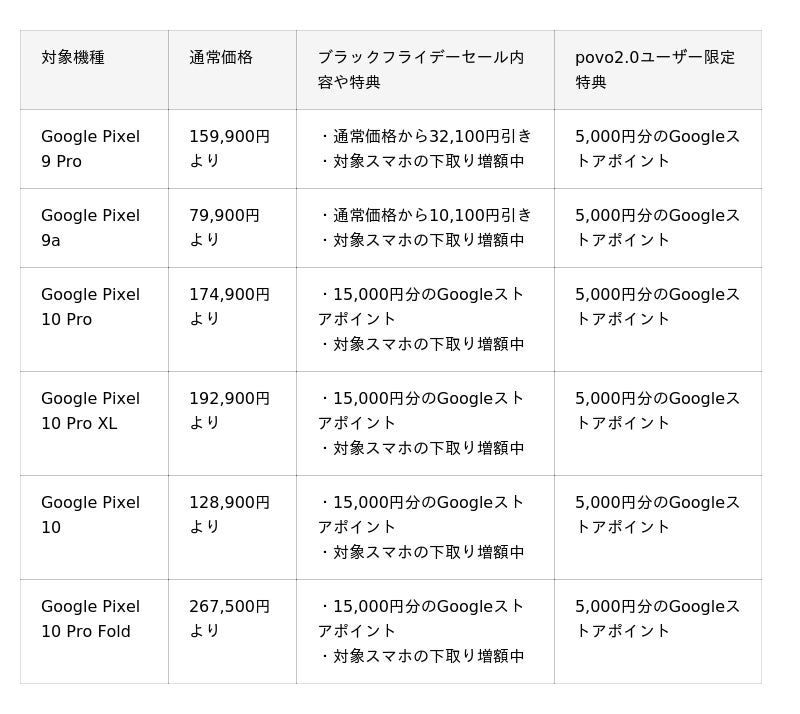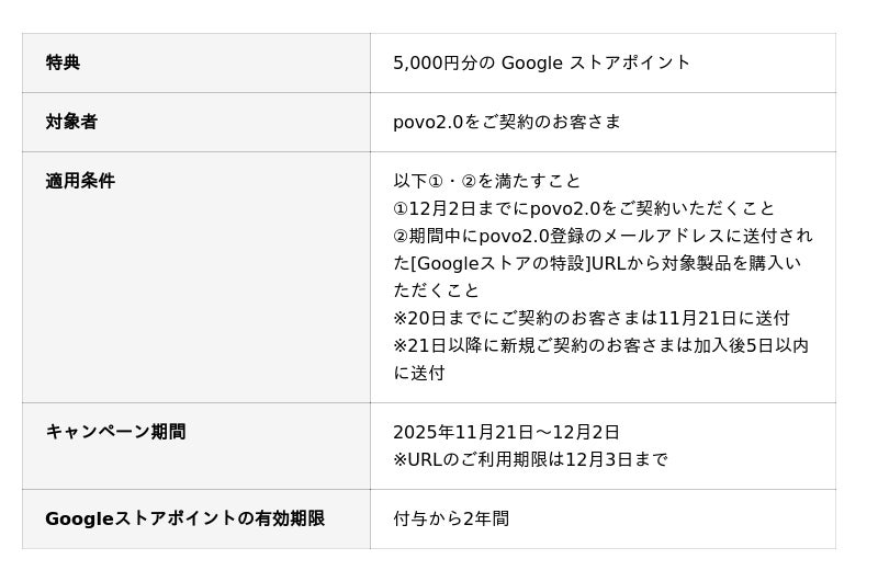 KDDI、沖縄セルラーは、2025年11月21日から、povo2.0ユーザーを対象に、Google ストアにおいてGoogle Pixel 最新端末含む対象機種を購入いただくと Google ストアポイントをプレゼントするキャンペーンを実施します。