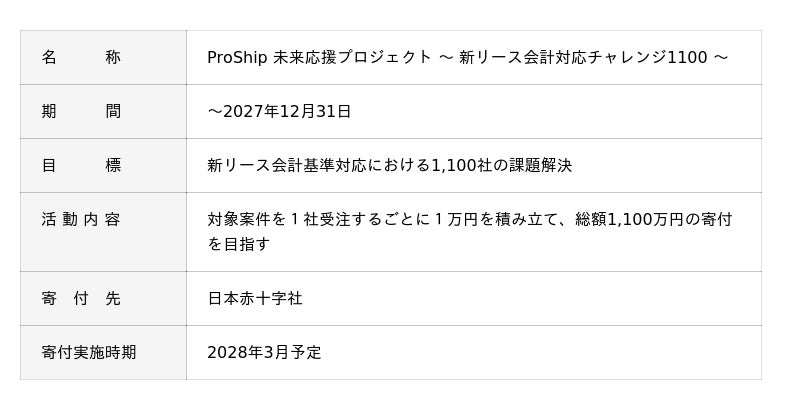 株式会社プロシップ(本社:東京都千代田区、代表取締役:鈴木資史 東証プライム:3763 以下「当社」)は、2027年4月に強制適用される新リース会計基準への対応を支援する事業活動と戦略的社会貢献活動(CSR)を連動させた新イニシアチブ「ProShip 未来応援プロジェクト ~新リース会計対応チャレンジ1100」を本日付で正式に始動することを発表します。