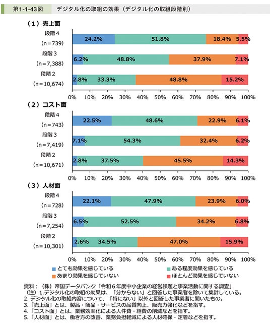 デジタル化が進むと業績に好影響がでる各取組段階は、以下のとおりに大別されている。