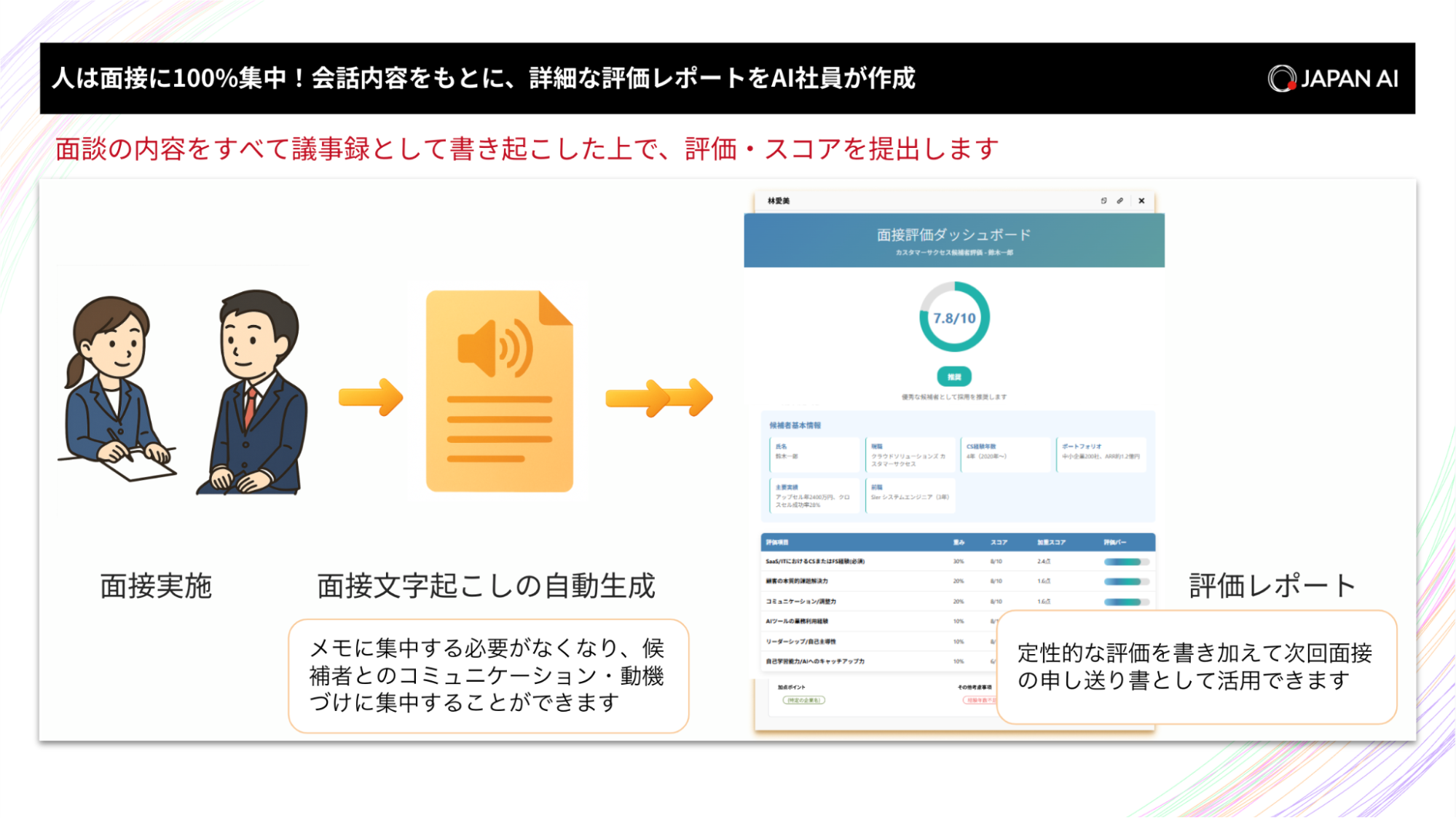 JAPAN AI株式会社(本社:東京都新宿区、代表取締役社長:工藤 智昭、以下JAPAN AI)は、採用業務の効率化・採用品質向上を支援するAIエージェント「JAPAN AI HR」の提供を開始したことをお知らせします。