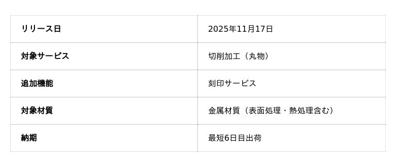 機械部品調達のAIプラットフォーム「meviy(メビー)」(サービス提供元:株式会社ミスミグループ本社)は、2025年11月17日より、切削加工(丸物)(以下、切削丸物)において、「刻印サービス」の提供を開始します。