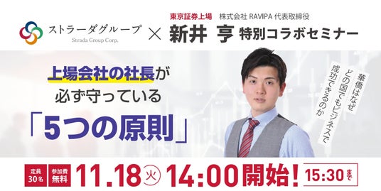 ストラーダグループ × 東京証券上場 株式会社RAVIPA 代表取締役 新井亨 特別コラボセミナーが、2025年11月18日(火)に開催いたします。