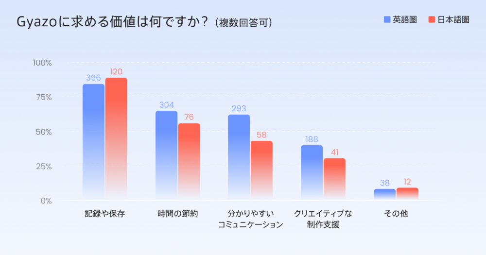 「Gyazoに求める価値」を尋ねたところ、最も多かった回答は「記録・保存」(英語圏85%、日本語圏89%)でした。「時間の節約」や「伝達の容易さ」を大きく上回り、スクリーンショットが“その場の共有”だけではなく、“後から必要な情報を取り出すための記録”として活用されていることがわかります。