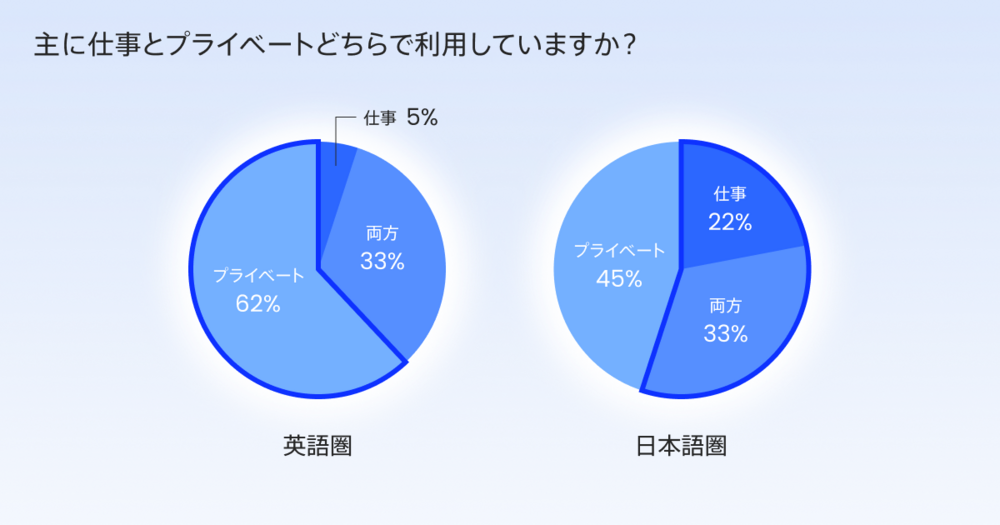 アンケート結果から、 画像の利用目的は国・地域によって明確に二極化していることが明らかになりました。英語圏では「プライベート利用のみ」が62%を占め、主にゲームなどの趣味や日常の記録といった用途が主流です。一方で、日本語圏では「仕事利用のみ」と「仕事との併用」を合わせた業務に関連する利用が55%となり、英語圏(33%)よりも業務領域での活用が進んでいます。