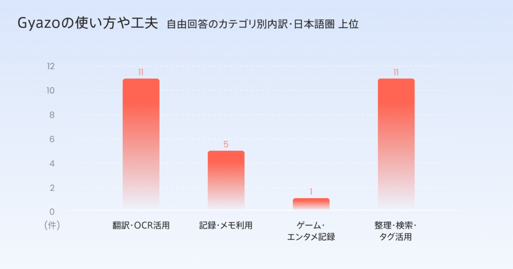 さらに、保存した画像をOCR(画像内テキストの自動認識)によってテキスト化し、AIや翻訳ツールへ入力する活用例も多く見られました。具体的には、映像の切り抜き、セミナーの投影スライド、手書きノート、海外ゲームの画面など、多様な画像から自動抽出されたテキストを用いて、ChatGPTやDeepLで要約・情報整理・翻訳を行うケースが挙がっています。特に日本語圏では、「翻訳・OCR活用」が「整理・検索」と並んで最も多い回答群となっており、画像がAI活用の起点として利用されている実態が浮かび上がりました。