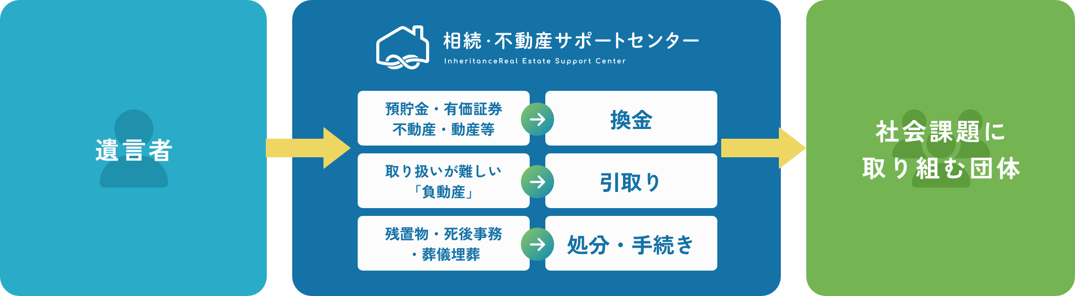 遺言者の方の想い(財産)を当法人が中間支援することで、非営利団体等にお届けできる仕組みです。