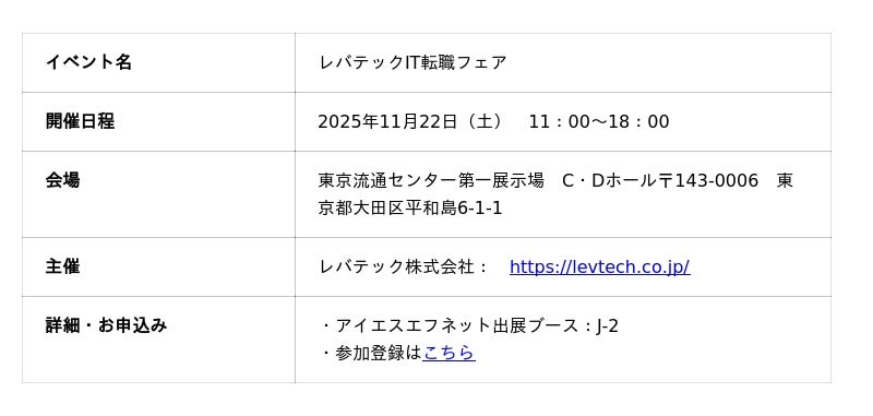 株式会社アイエスエフネット(本社:東京都港区/代表取締役:渡邉幸義、以下アイエスエフネット)は、2025年11月22日(土)に東京で開催される「レバテックIT転職フェア」に参加いたします。