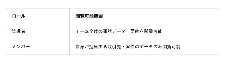 営業活動において、顧客との会話データは非常に価値の高い情報資産。通話履歴や商談記録などの共有範囲を適切に管理できないと、誤閲覧による情報漏洩リスクに加え、情報の属人化という課題が生じます。Mazrica Salesの「ロール(権限)」設定機能は、ユーザーの役割に応じて参照可能なデータ範囲を制御できる仕組みです。pickuponをこの機能と連携させることにより、ロール設定が通話データにも適用され、営業チーム全体で情報共有を維持しながら、安全なアクセス制御を実現しました。